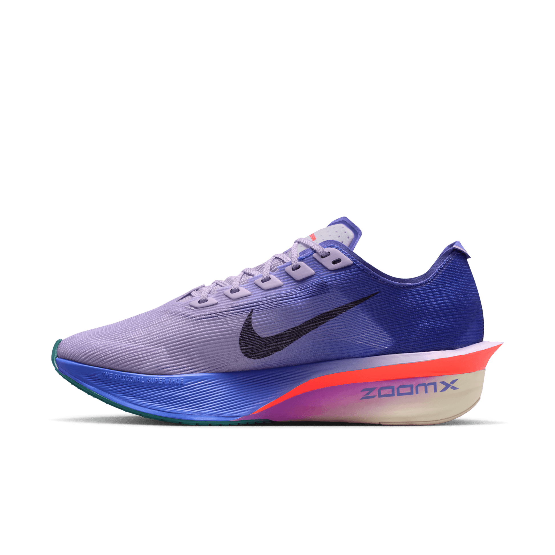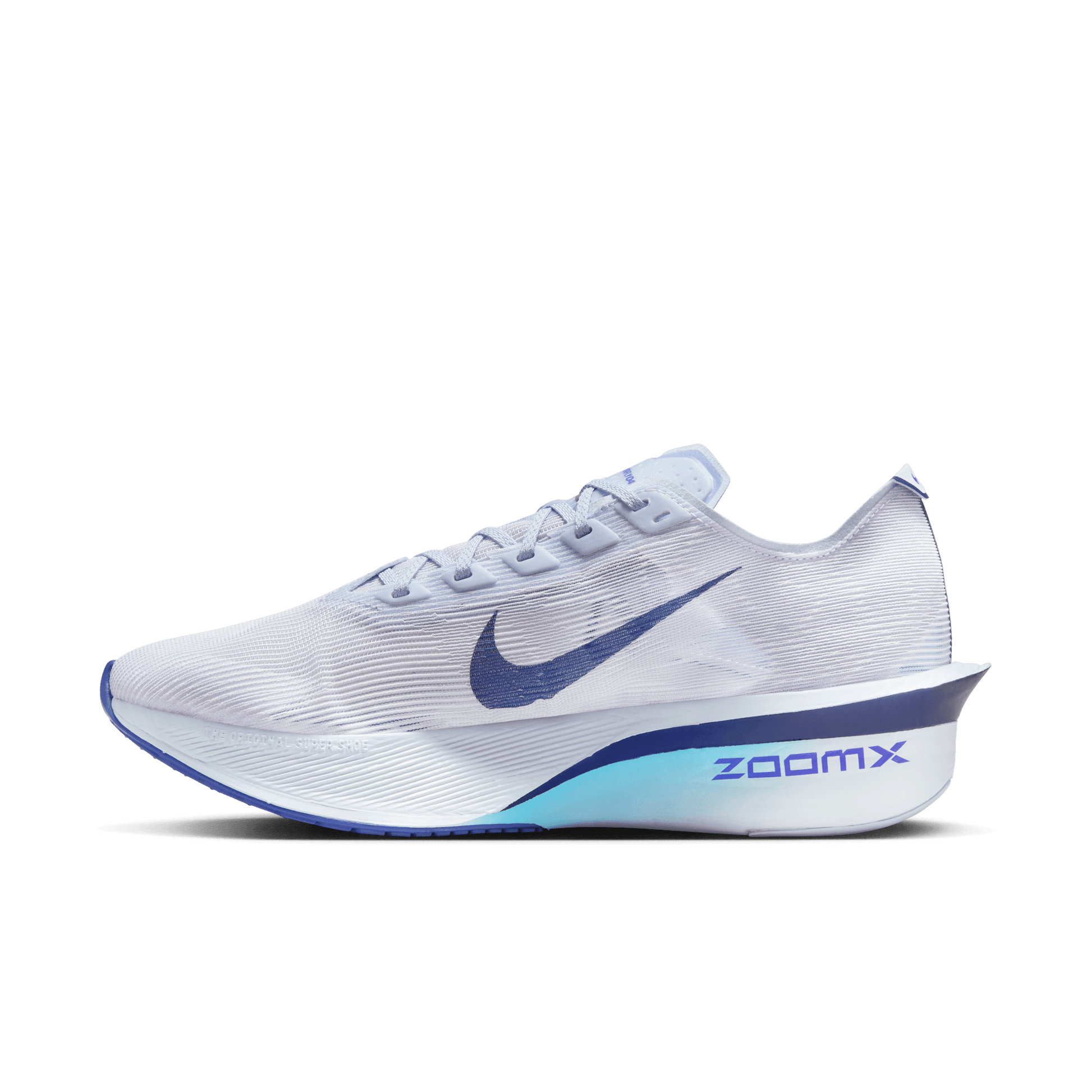 Nike ZoomX, our most responsive foam, just got lighter. Running from heel to toe, it unlocks even more energy return than before thanks to a slight midsole reduction, giving you a bouncy, feathery feel.